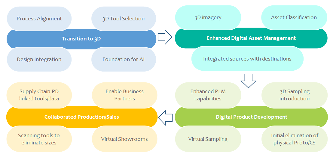 As part of Product Development, the ideation of new product concepts is kicked off in the Design phase. Traditionally, most of the factors driving these designs have been a combination of historic seasonal data points and new trends. However, due to consumer demands playing a larger role growing in the overall product development process, the industry has been forced to shift to the next generation of supply chain process – a process that is built around customer interaction. Without upfront buy-in from consumers, the adoption on new and carryover products can be extremely risky. Hence, brands need to incorporate new consumer-oriented design strategies into the supply chain to ensure consumers embrace their styles. And the clear path forward would be to use state-of-the-art integrated technologies to provide consumers an enhanced experience.