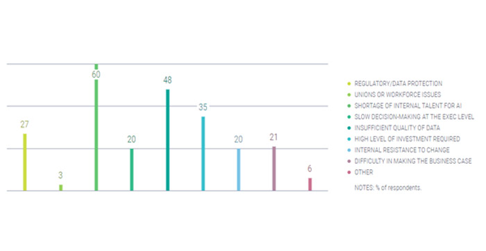 In a recent study conducted by MIT Technology Review Insights, senior executives working at midsize-to-large organizations around the world were surveyed regarding the application of AI in their organizations. They named the following as the top challenges they face in AI deployment –