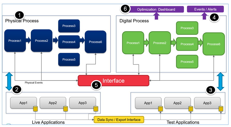 The Digital process is now made to exactly replicate the production physical process by recreating the conditions as they happened. This activity ensures the test application and the live application are in real-time sync, and the twin is connected continuously and is picking up event data as they happen.