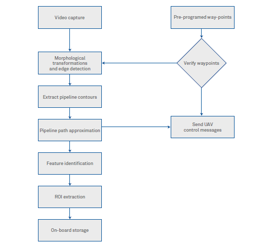 A UAV equipped with a visual or infrared camera can be used to perform regular patrolling duties. UAV platforms equipped with such devices can be configured at take-off, navigate and patrol a segment of pipeline, identify and capture images or videos of areas of interest at pre-defined timings and return to their base station with little or no human intervention. On-board GPS sensors and waypoint data can be used by a UAV to plot the path to be taken, make necessary course corrections and hover in place as directed by the parameters configured (Figure 10). The parameter configuration can be performed either pre-flight or in-flight. UAVs can also stream real-time surveillance images and generate notifications when any unusual event is observed.