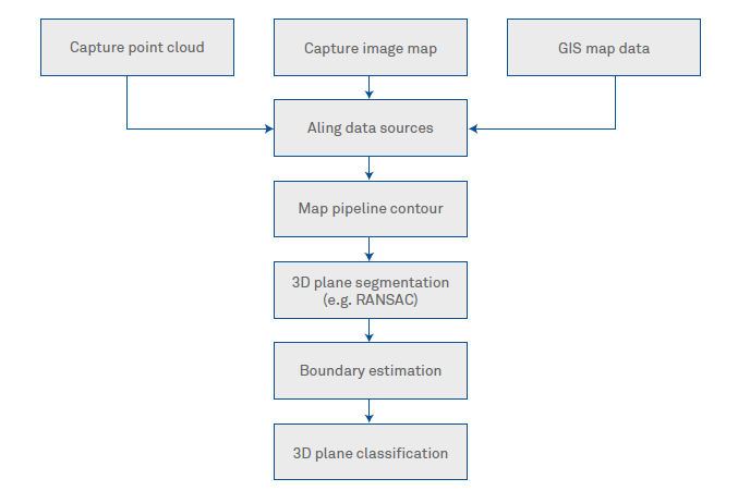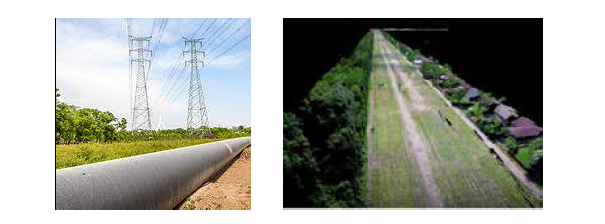 Encroachment to right of way is one of the key challenges faced by the industry. Construction and close proximity of residential space can spell disaster in case of any mishap. Encroachment to right of way can also be caused by vegetation growth or deliberate act of vandalism. Drones can help identify the affected section and map the surrounding area by means of 2D image mapping or 3D point cloud mapping of the terrain using a high definition camera or a LiDAR. A UAV equipped with onboard LiDAR can scan along the length of a segment of the pipeline and generate accurate point cloud maps. The area can be geo-tagged and the information can then be passed out to the backend system for comparison against the planned layout (Figure 16). Once an encroachment is determined, crews can then be dispatched to facilitate its clearing.