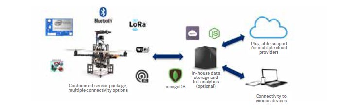 The Wipro SmartDrone platform (Figure 18) is designed as a flexible and customizable platform that allows a user to deploy interchangeable sensor package as payload with ease. SmartDrone can perform tasks like video surveillance, LPG concentration detection, smoke detection, emergency response, and is capable of autonomous flying including take-off and landing, programmable flight path, waypoint navigation. SmartDrone edge platform is capable of performing edge analytics, generating periodic as well as priority alerts, capturing telemetry data, controlling drone flight characteristics and can automatically select the optimal communication channel from a set of supported connectivity options including Bluetooth, WiFi, 3G and LoRA. Wipro is also developing edge and backend analytics components for crack and corrosion detection, pipeline contour tracking, pipeline leak detection and automated surveillance using various image analytics and deep learning techniques.