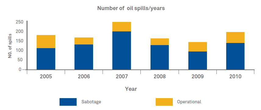 Theft, sabotage, terrorism and vandalism are becoming the major cause of pipeline failures involving deaths and injuries (Figure 9). Pipelines are easy targets for terrorists, for example, a terrorist plot to destroy fuel pipelines at John F. Kennedy airport in 2007 was foiled by the FBI. According to studies in Nigeria, third-party damage is the leading cause of ruptures in pipelines. Attacks by vandals and thieves including ‘hot tapping’ (drilling into a pressurised pipeline) and ‘bunkering’ (illegally obtaining fuel from pipelines) are a major source of product loss. These incidents also lead to huge loss of lives to fire and other hazards involved. Other damages to the pipelines can come from lightning, cold/freezing weather, earthquakes, heavy rain or floods, earth movement, damage of structures etc.