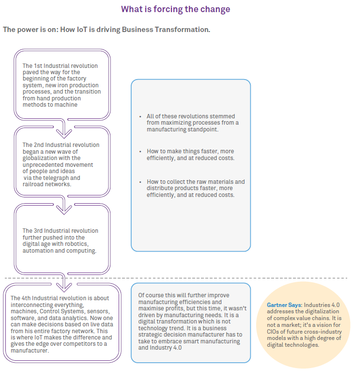 Manufacturing plants are already automated to a good extent. However, what is lagging is usage of data for business transformation. In this paper, we will cover IoT in the manufacturing industry enabling Industry 4.0: