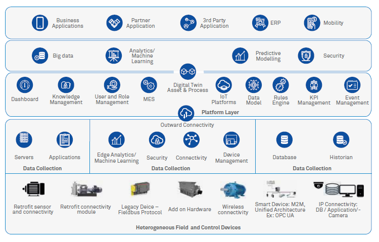 Connectivity: This layer does the job of field data consolidation. It is very important that data collected through various protocols from a heterogeneous field and control devices are converted to a unified format. An area that is piquing everybody’s interest in the industry is Edge Analytics. Small foot print Analytics running in the Edge/Gateway devices and finite data storage in Edge helps production managers and operators to take decisions faster.