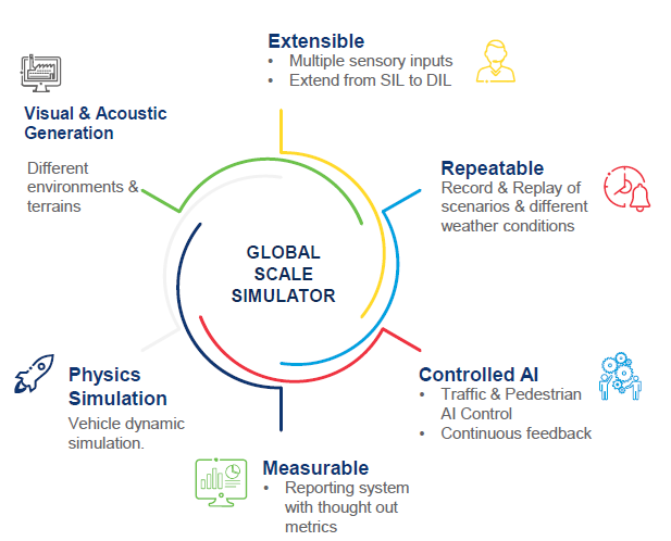 The SDV in a box is also capable of simulating multiple weather conditions and shows real time sensor data from camera and LIDAR. The simulator is highly scalable and can be used in replicating specific world environments as well to test vehicles within such scenarios and conditions.
