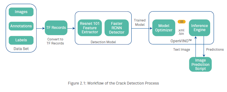 Convolutional Neural Networks (CNNs)5 are a class of deep-learning neural networks6 that are frequently used in image classification and segmentation (pixel-wise classification) tasks. They are known for adaptability, particularly in cases where the neural network topology has many layers, which has been shown to allow them to learn low-level features t(e.g., lines, edges and angles), and high-level features (e.g., curved surfaces and textures). Our approach to automatic crack detection leverages a topology belonging to this class—Faster R-CNN3 with ResNet-101 as a backend feature extractor, enabling it to detect and draw a bounding box around any crack identified in an image.