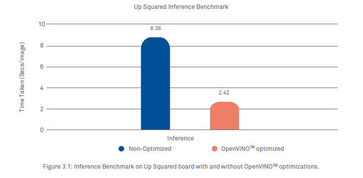 The main motivation for us to use OpenVINO™ [1] is to enable our model to be deployed onto smaller edge devices, which can be placed onto the UAVs. As a result of these optimizations, we can achieve better performance even on small devices, like an AAEON board8 with an Intel® Celeron™ N3350 processor. We observed a performance gain of almost 3x using only the processor. Up Squared is a small, portable and power-efficient board—an excellent option for an edge device that can be deployed in setups where speed can be compromised a little for the performance per watt of power. A comparison of performance on an Intel® IoT board with and without OpenVINO™ optimizations is shown in Figure 3.1.
