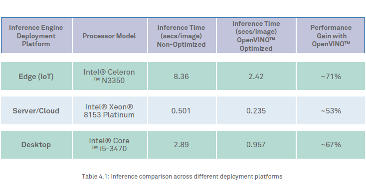 Through this paper and the approach discussed above, we have demonstrated the use of CNN-based deep learning inferencing on edge devices with Intel® Processors, for automated structural assessment of concrete surfaces. The performance results tabulated in Table 4.1 below demonstrate a significant performance gain with OpenVINO™ enabled Inference Engine across different form factors, ranging from an IoT device to a server grade set up. The performance gain being highest, ~71%, for Inferencing at the Edge. The significant performance gain comes at negligible loss of mAP as shown in Figure 2.9 above.