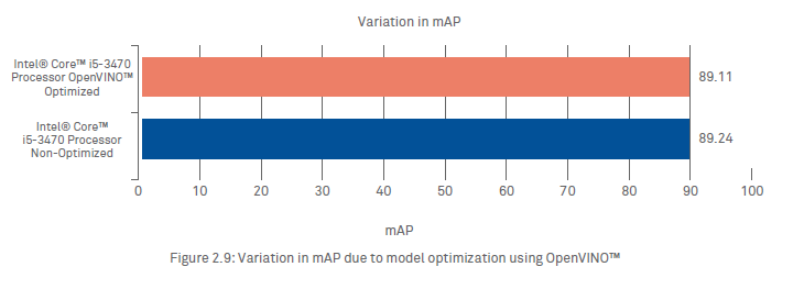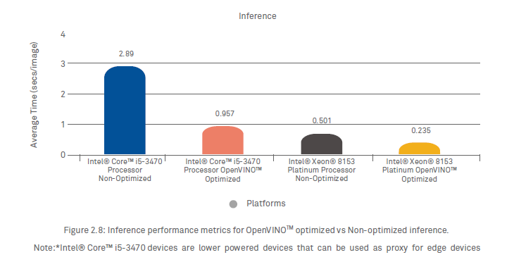 The average inference time taken for each image on a desktop-grade Intel® Core™ i5-3470 Processor and Intel® Xeon® Platinum grade Processor, with and without the Intel Distribution of OpenVINOTM toolkit optimization are shown in Figure 2.8. As shown, the Inference Engine (using the intermediate representation of the model) makes faster predictions than the non-optimized inference engine on the same machine. In our experiment, we saw a drastic reduction of ~67% in inference time using the inference engine with OpenVINO™ optimizations on an Intel® Core™ i5-3470 Processor and ~53% reduction in inference time on an Intel® Xeon® 8153 Platinum Processsor.