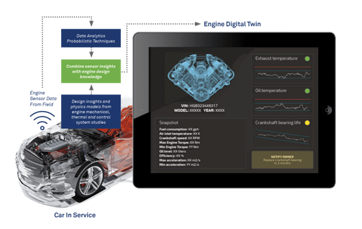Once the asset is deployed in service, its sensors release a massive and varied amount of data that necessitate the use of data-driven techniques to obtain operational insights. Advanced techniques in data science, such as anomaly and outlier detection and Bayesian methods, are employed to obtain statistical insights from the field sensor data. Sensor enabled data and associated insights constitute the second building block of a digital twin. Figure 1 illustrates these building blocks for the case of a digital twin of a car engine.