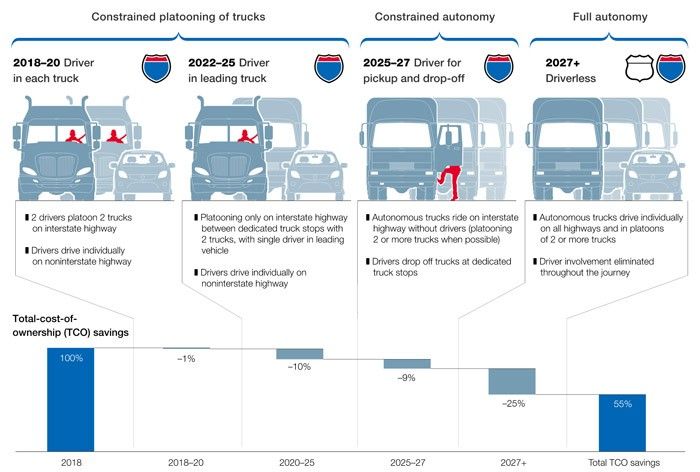 Full autonomy, however, is still a long way off. McKinsey Center for Future Mobility, estimates that the deployment of ATs will happen in 4 stages, the cornerstone in the short to medium term being “platooning” - a technique to connect wirelessly a convoy of trucks to a lead truck, allowing them to operate safely much closer together and realize fuel efficiencies. The report estimates that each wave will lower the operators’ total cost of ownership (TCO) in stages—moderately at first with the bulk of savings expected with implementation of higher autonomy levels.
