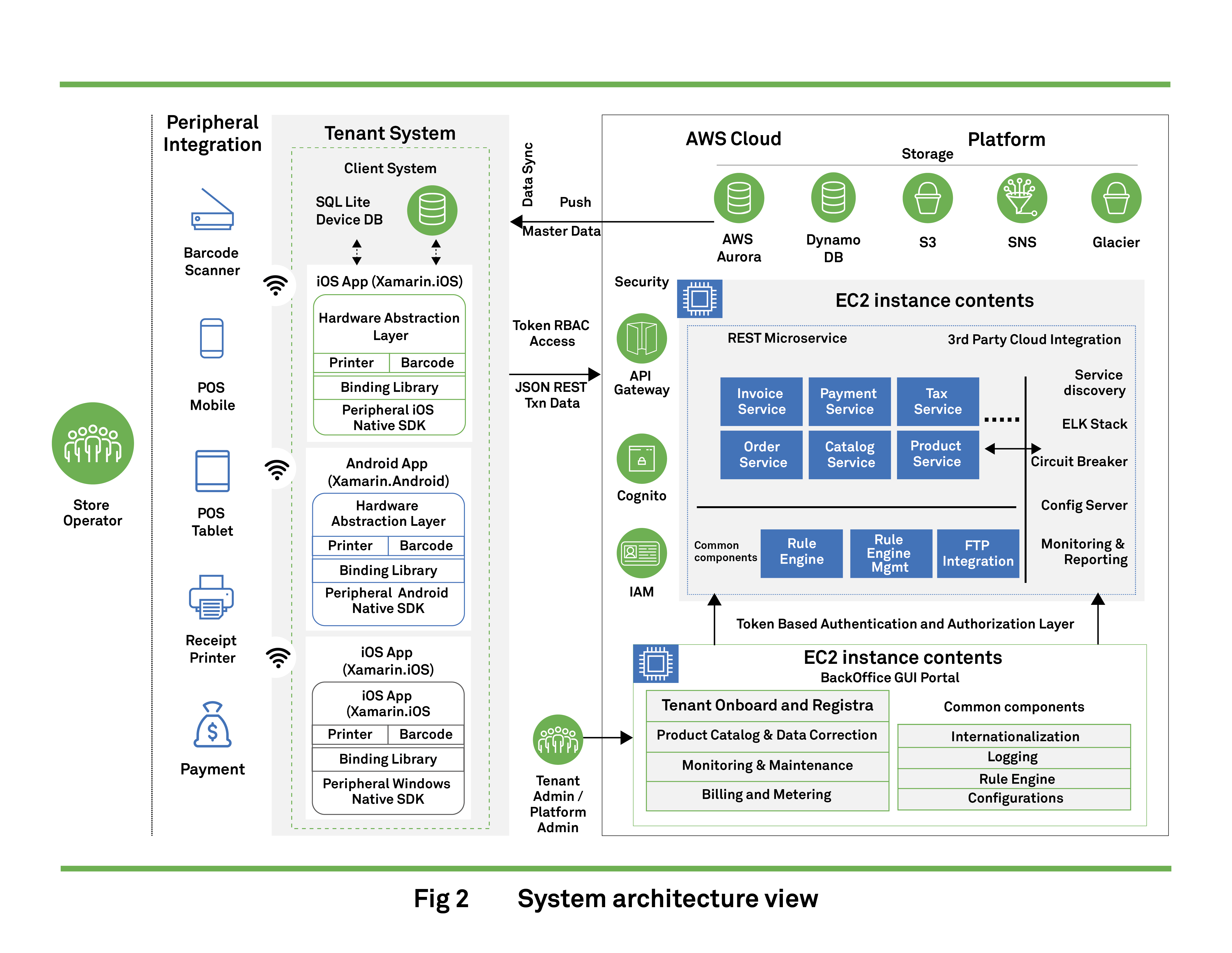 The system is divided into three sub-systems: the core platform system, the client (tenant) system, and the peripheral devices integrated into it. The tenant system comprises the GUI of the store operator’s system, or it could also be the UI for the self-checkout kiosk that end users operate. The tenant system integrates various other peripherals like the card payment, printer, barcode scanner, etc.