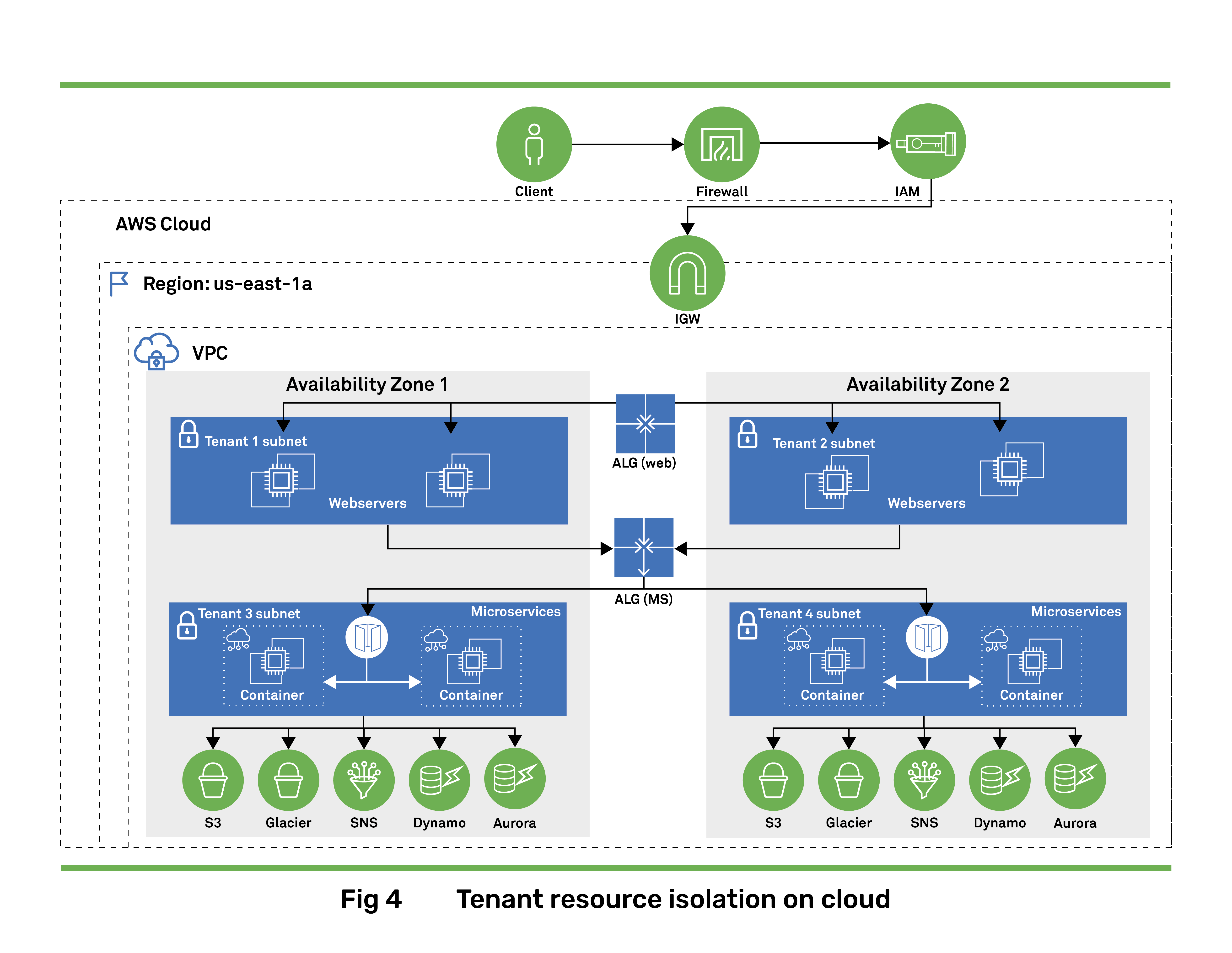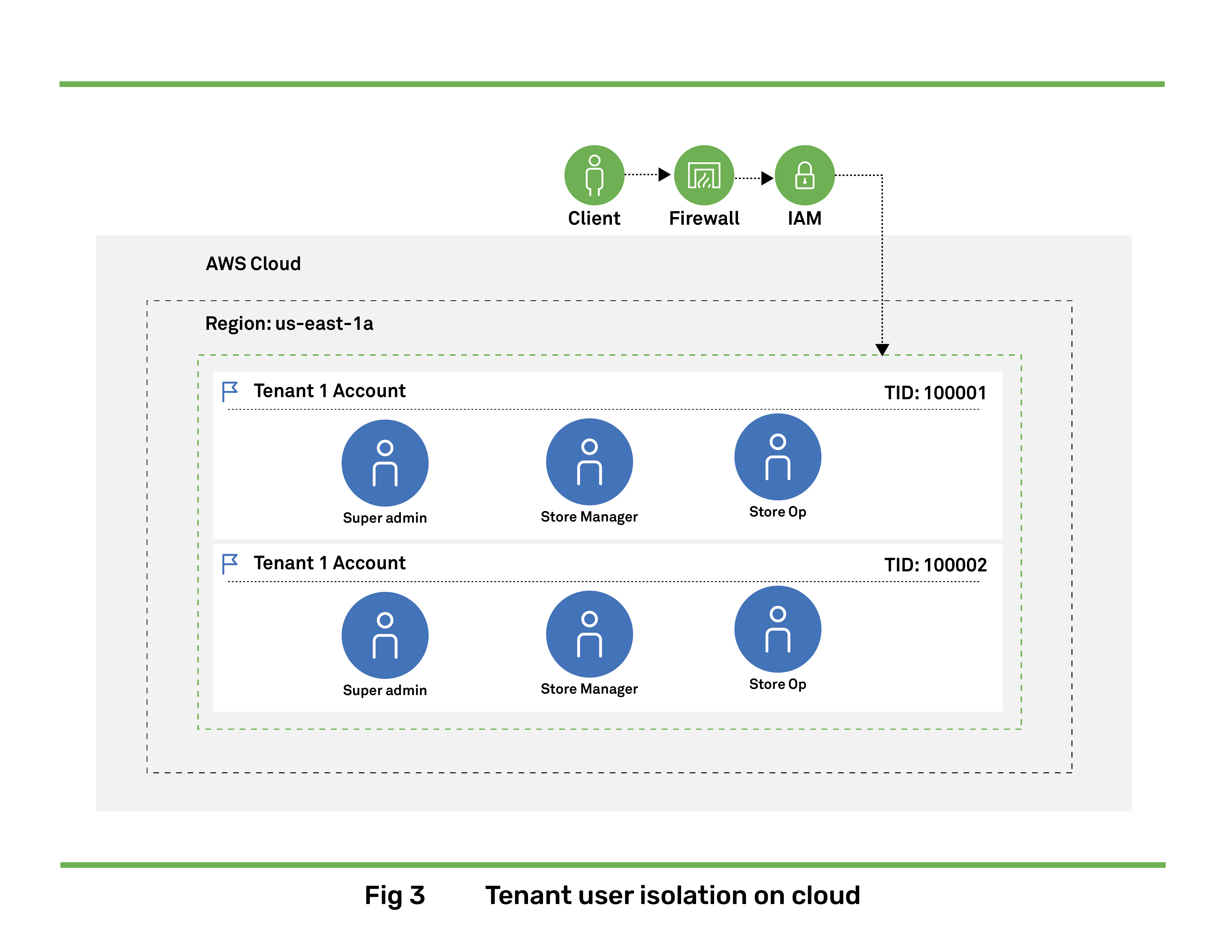 Tenant user management is handled with an IAM system, which is available on cloud platforms. A single tenant could have a single account with different user groups and policies underneath it for better role-based access control (RBAC) management. This provides tenants with complete data segregation and security. Using a token-based access mechanism like OAuth can control and prohibit tenant access to downstream systems like service, database schemas, etc.