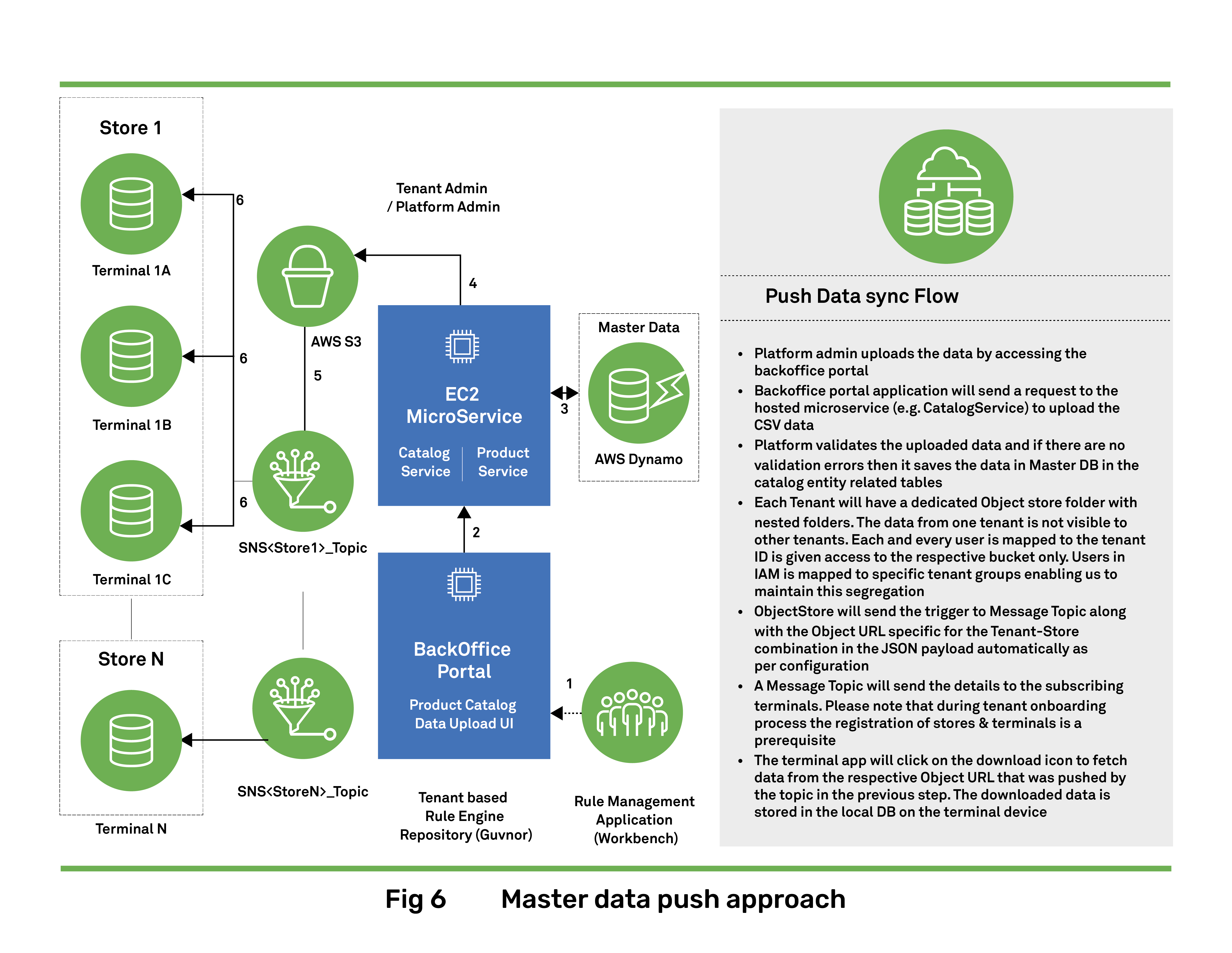 MDS can be achieved by either push or pull approach. The push approach pushes the data from the server to the terminal side. A custom data pipeline could leverage the existing components based on the below design.