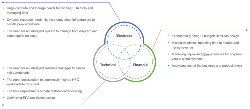The growth trajectory of semiconductors is continually increasing, resulting in accelerated silicon design cycles and compressed timelines. Technology nodes are also becoming increasingly complex — thinner, smarter, and faster — requiring significantly higher compute and storage demands. Figure 1 below depicts the typical challenges in handling silicon design workloads.