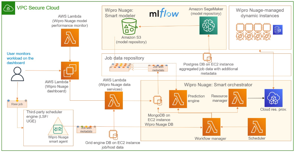 Built in close collaboration with AWS, Nuage automates the process of identifying the right resource requirements and ensures that only as much is reserved during the process of electronic design automation (EDA). It uses AWS SageMaker to build, train, and deploy ML models that help in identifying the right data size. When a design engineer submits a job, a Wipro Nuage agent invokes an AWS Lambda Service responsible for orchestrating the process of identifying the right size for the workload. If an instance is not available in the pool, Nuage will use the AWS Cloud Formation template to create the rightsized instance for the job.