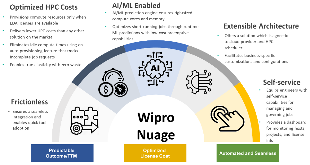Wipro Nuage shortens tape-out cycles, increases productivity, and enhances customer experiences. It also significantly optimizes high-performance computing (HPC) costs for EDA workloads, shifting spending from capex to opex and improving asset utilization. Wipro Nuage can be integrated with an enterprise’s existing IT system, and its modular, customizable capabilities allow it to handle future business demands (see Figure 3).
