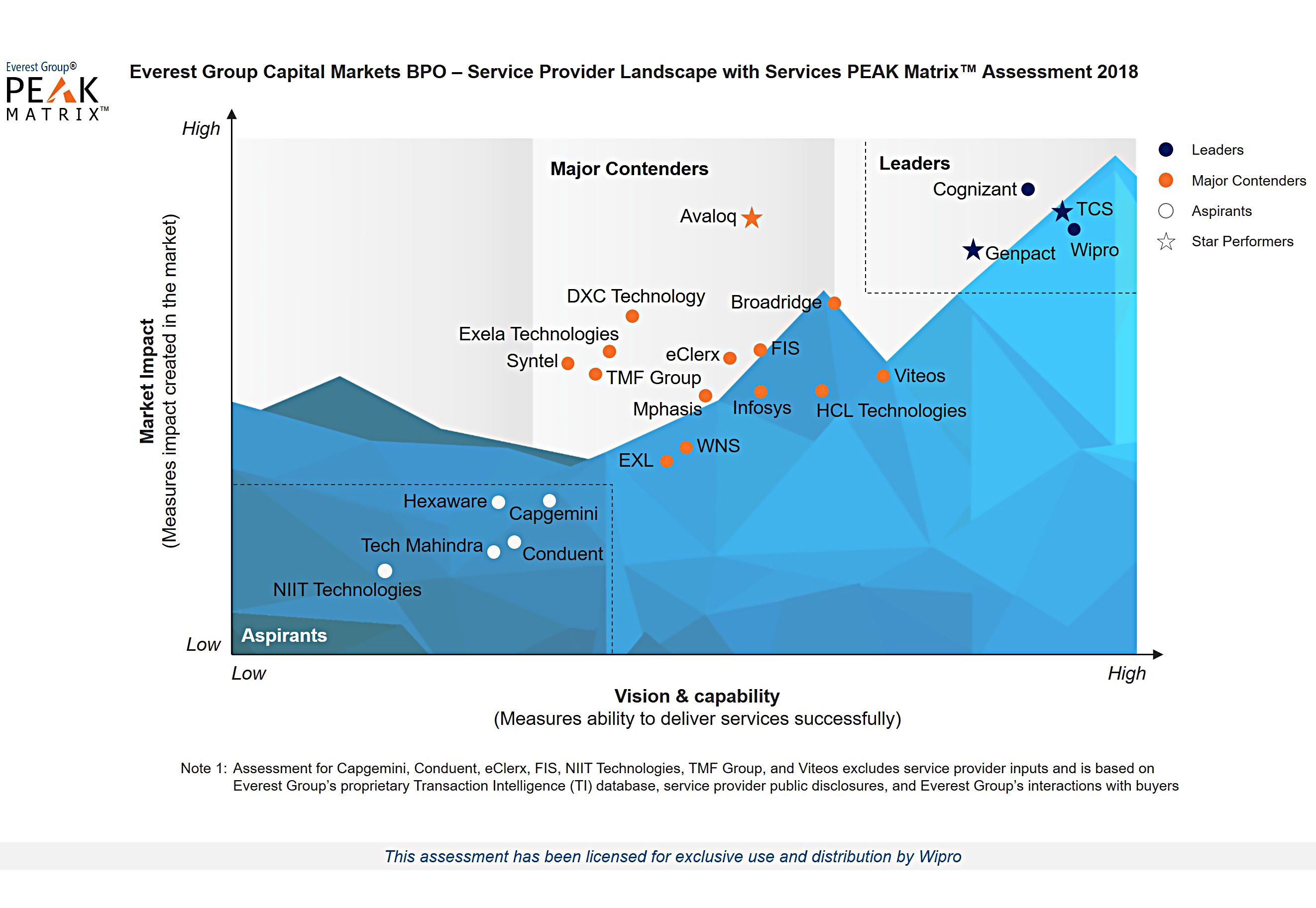 Everest Group updated its classification of 20 service providers on the Everest Group PEAK Matrix for capital markets BPO into Leaders, Major Contenders, and Aspirants. The PEAK Matrix is a framework that provides an objective, data driven, and comparative assessment of capital markets BPO service providers based on their absolute market success and delivery capability. Based on the analysis, Wipro emerged as a Leader.