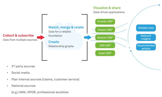 Once a reliable data foundation is established with continuous data quality management, it can be visualized in consumer grade applications. Business teams can confidently use data driven applications to segment providers based not only on location and specialty but any attribute available. Analytics and visualizations are built into data driven applications, delivering relevant insights that align with the objectives of the business user, reducing the “hunt and peck” required by standalone do-it-yourself business intelligence and analytical-only tools. Leveraging predictive analytics and machine learning, data-driven applications provide intelligent recommended actions guiding users to make informed decisions.
