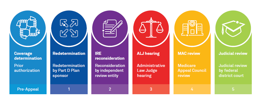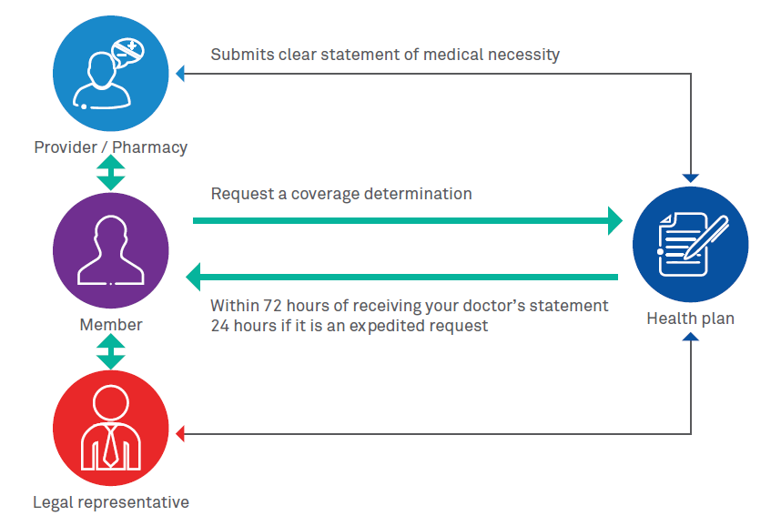 Before starting an appeal process, members must submit a written form to the drug plan and get a written coverage determination (prior authorization). Just getting a ‘no’ at the pharmacy is not considered enough for a coverage determination or for starting an appeal process.