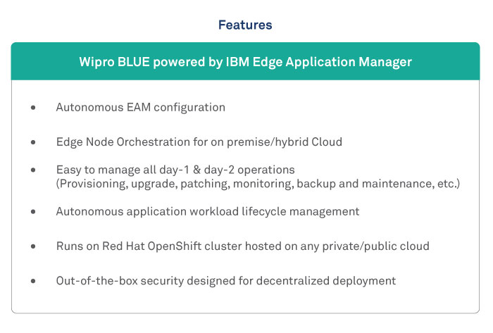 Wipro’s BLUE integrated with IBM Edge Application Manager helps in managing these challenges. This solution is built on the foundation of OpenShift and Container technology and helps in autonomous lifecycle actions on thousands of edge nodes. This solution solves operational and management complexity faced by the enterprises.