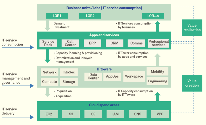 Transparency between benefits/outcomes and costs/investments is an important element of overall cloud governance. Usually, the cost of cloud is viewed as various types of spends such as servers, storage, SaaS licenses, platforms, virtual networks, etc. The need is to leverage TBM principles to establish cost transparency for growing cloud adoption, then associating these with projects and programs as well as the underlying progress and outcome measures. Applying TBM principles provides visibility into various types of cloud spend areas with the IT towers and IT services and the functions or business units that are consuming the cloud resources in the form of IT services (Applications, contact centers, etc.).