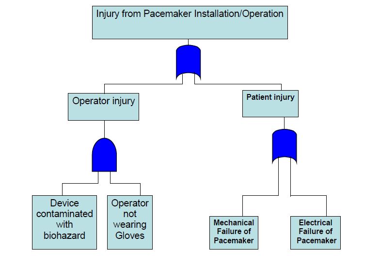 An FTA is an effective top-down approach. The team starts with the undesired consequence or top event and identifies the initiating and contributing events that must occur to produce it. These events are combined using logic gates. A logic gate is the point at which two or more independent events are combined in order to produce a higher-level event. The logic gate determines whether the sub event probabilities or frequencies should be multiplied, for an and gate, or added, for an or gate. If all events under a gate are necessary for the higher event to occur, an and gate is used. If each of the events is sufficient to produce the higher event on its own, an or gate is used. Both mechanical failures and human errors can readily be included in a fault tree. An example of a partial fault tree for a pacemaker is shown in Figure 4.