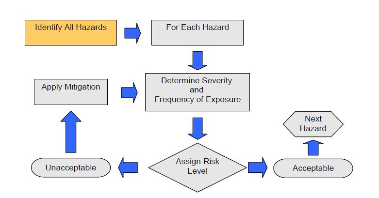An overall risk management process involves the essential steps in Figure 1. In order to manage risk, hazards must first be identified. By evaluating the potential consequences of hazards and their likelihood, a measure of risk can be estimated. This value is compared to the company's risk-acceptability criteria and, if it is too high, the risk needs to be mitigated.