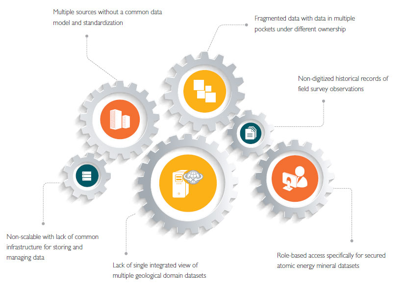 There is a need to comply with data interoperability and metadata standards such as Open Geospatial Consortium (OGC) and Federal Geographic Data Committee (FGDC). Open Geospatial Standards lay out yardsticks for defining Web Map Services interfaces that can readily be consumed by compliant platforms on the Internet. FGDC develops standards on different themes of geospatial data. Some of the other business challenges are real-time monitoring of field survey data,performing integrated search across multiple geoscientific domain data and providing secured role-based data access.
