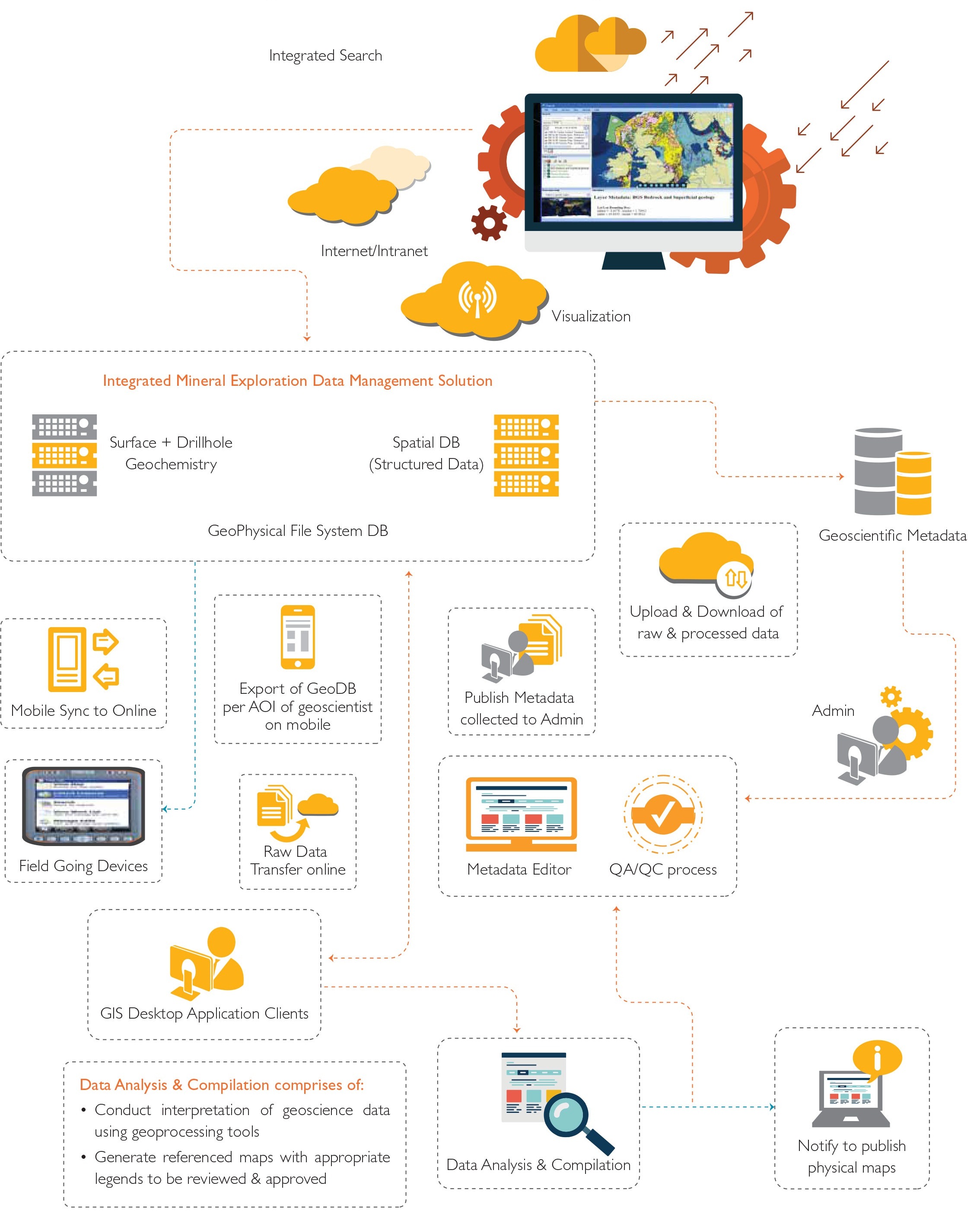 The data process flow diagram (See Figure 2) depicts how integrated mineral exploration data management solution helps in providing seamless consolidation and dissemination of exploration data.