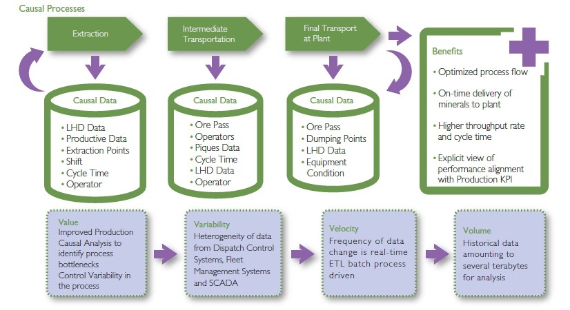 Big Data Analytics Platform, equipped with these models, can leverage the value, volume, velocity and variability of data, delivering several benefits across extraction, intermediate transportation and final transport to plants. Figure 3 shows the causal data used at each process step to improve operational effectiveness and enable higher ore yields.