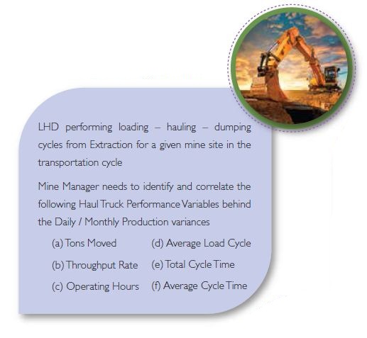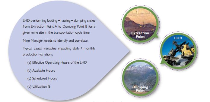 Material process flow plays a big role in the mining value chain. This includes analyzing impact of unscheduled events owing to mechanical breakdowns of LHDs, trucks and critical transportation medium, queuing time, and such overheads. There are a number of other causal variables that can be analyzed for impact on production throughput on a daily/monthly basis using techniques such as Machine Learning, Continuous Pattern Matching and Statistical Predictive Model.