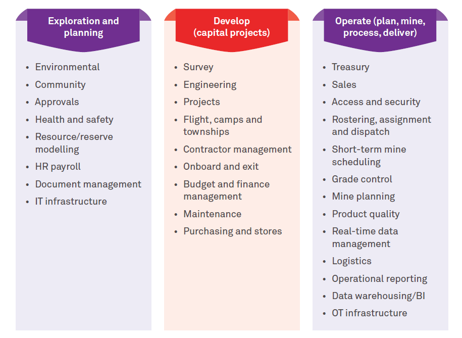 To minimize complexity and optimize costs, a better approach for this segment would be to look for pre-configured solutions on the Cloud with minimal customizations that deliver a set of business processes, industry-standard security controls and preconfigured performance indicators. Ideally, these should come bundled with a set of mining best practices to cater to mining asset and cost structures, and commodity management that can be rapidly deployed within a few months on the Cloud or in multiple phases aligned with the capital project schedule. Opex models which include the technology platforms, license, and services bundled together, can provide cost optimization options.