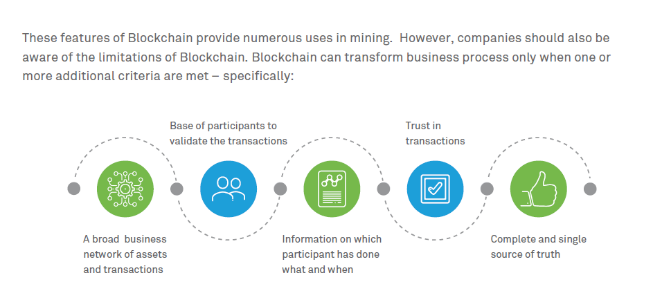 These features of Blockchain provide numerous uses in mining. However, companies should also be aware of the limitations of Blockchain. Blockchain can transform business process only when one or more additional criteria are met – specifically: