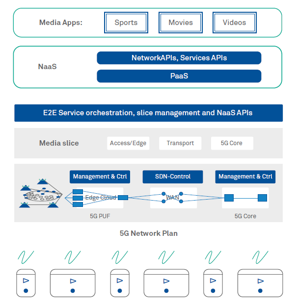 OTT players would like to offer very high-quality videos with low latency & minimum buffering to users. OTT player can leverage 5G Core with NaaS APIs to program the network based on subscriber choice and create slice to deliver the content using right deployment model of 5G core resources. Following figure depicts the layers involved in creating service and how OTT player can take advantage of NaaS APIs.