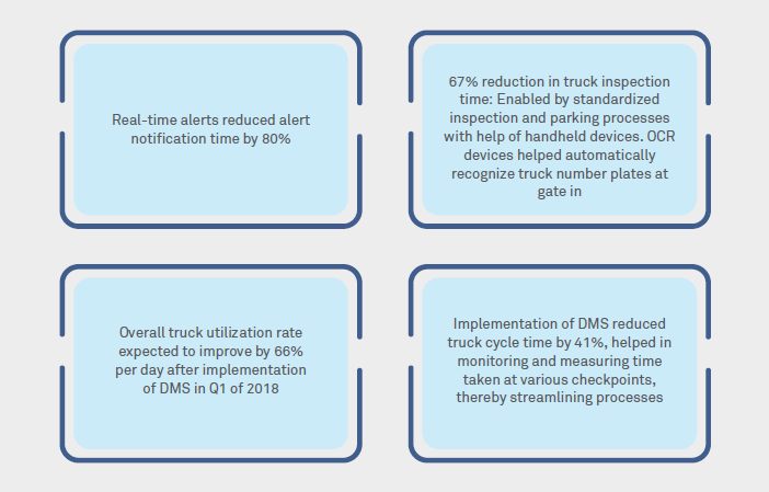The terminal, which supported a daily fleet of over 120 trucks that carried shipments to the industrial area, was in urgent need of a Dispatch Management System (DMS) that would provide controlled and monitored dispatches. The aim was to reduce truck cycle time, keep a track of parked trucks and their linked shipments details on a single screen, and bring down notification drafting time sans manual errors.