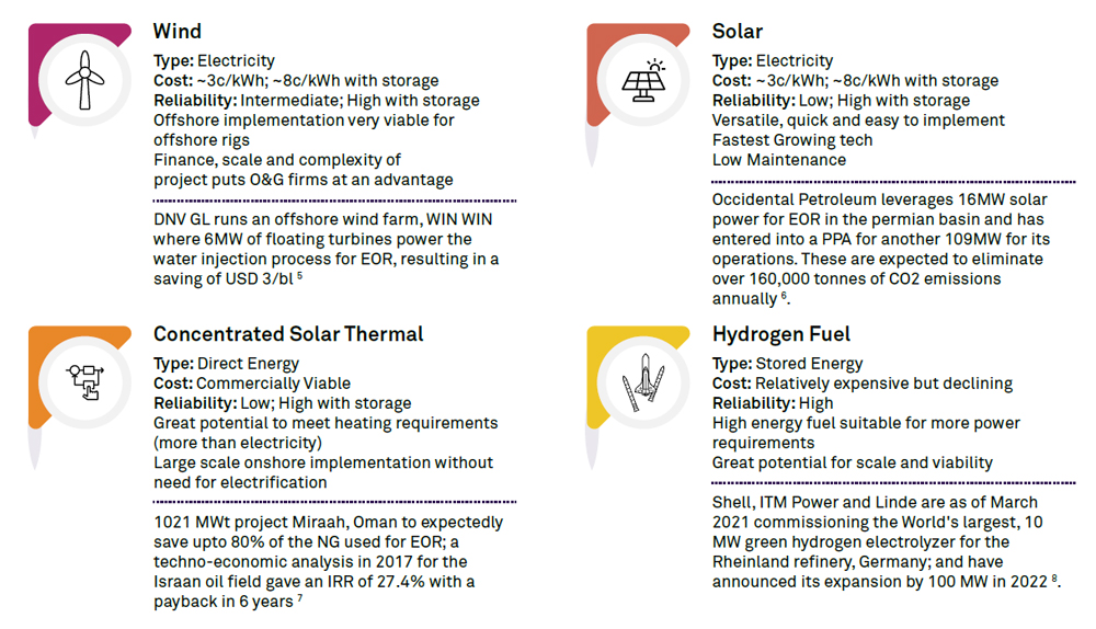 Renewables have a major role to play in today’s oil and gas companies, if those companies are willing to really understand how renewables can fit into their existing operations and future plans. For example, current power generation in refining units accounts for 13% of its emissions[9]. Wind and solar power are now more commercially viable than fossil fuels in most scenarios. In fact, it does not take many modifications to an existing power-generation infrastructure to use renewable sources. And if renewables are integrated into the mid- and upstream sectors, that 13% will surely increase.