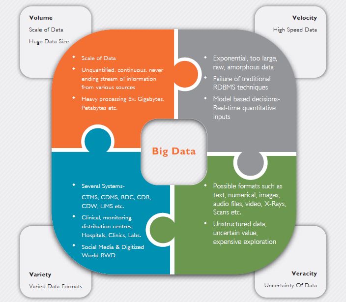 The growing transformation towards ”e” systems (e-CRF, ePRO and EDMS) is also making companies revisit their data management and analysis applications. With ”data-to-insights” cycle coming into play, pharma companies can emphasize more on a stack of tools such as Hadoop, NoSQL Databases,MapReduce, In-memory Analytics, Enhanced Cloud Computing and Storage. This will help organizations build a framework to extract useful features from large datasets to further understand how to model structured and unstructured data, and decrease the time to information.