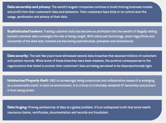 While data democratization is on the rise, acquiring and securing massive amounts of relevant patient, genomic and research data remains a herculean challenge. The distrust around security, privacy and usage of data is rooted in some of the structural challenges discussed below.