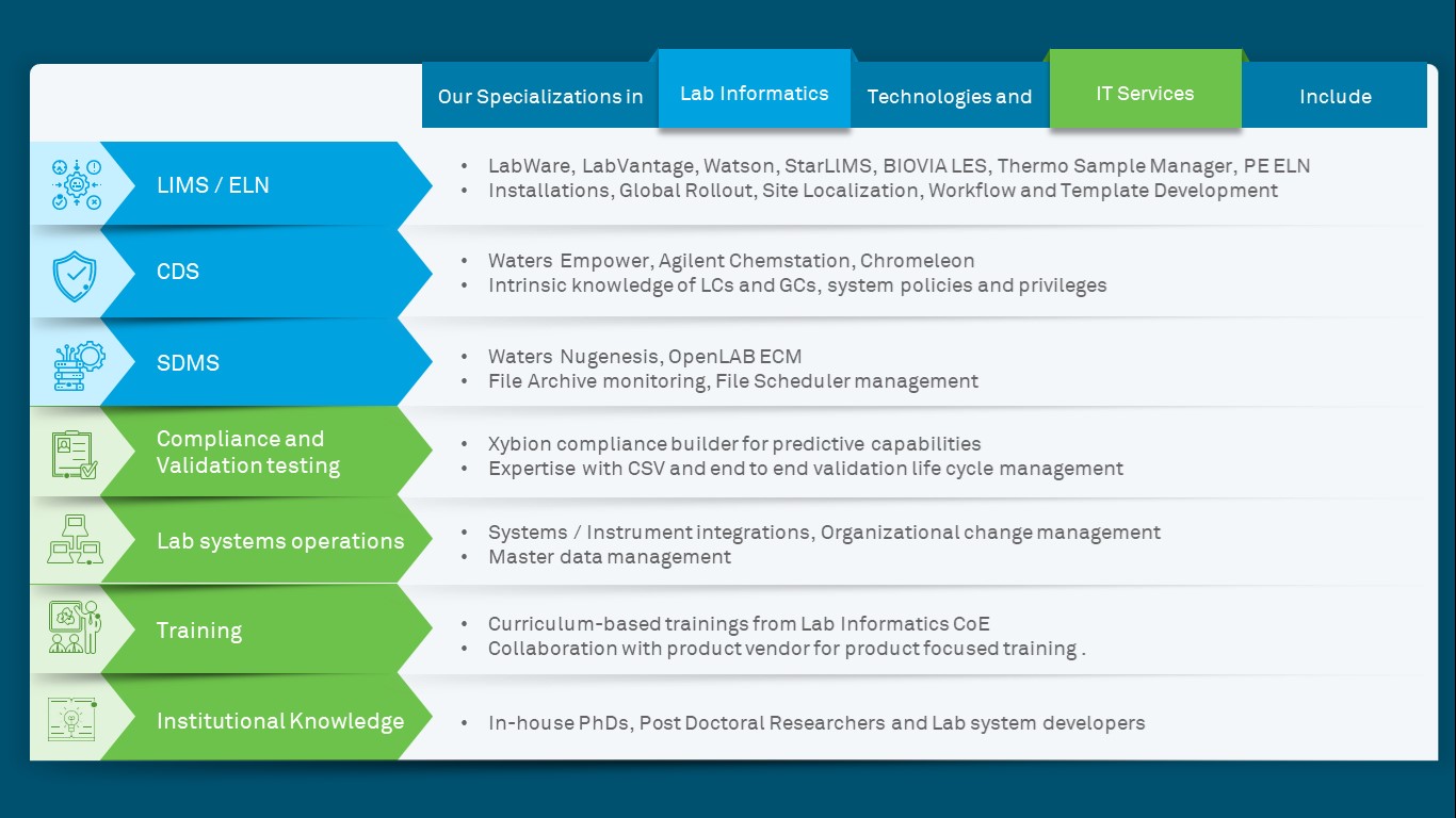 The pharma and biotech industries are constantly on the lookout for services that can be integrated across the continuum of drug discovery and development needs. Wipro uses its Digital R&D Lab platform to co-create with regulators, academia and corporate partners. These contract research services are reliable and consistent as they develop deeper, longer-lasting relationship with their sponsors, delivering speed across geographies. This pharma lab as-a-service offering combines rich domain consulting expertise and cutting-edge technology expertise to fuel the innovation engine delivering precision medicine while lowering the overall cost of drug discovery and development. The GMO & genetic testing services and microbiology lab are fuelled by experienced researchers certified in lab automation technologies (LabWare, LabVantage, IDBS, Genedata, Thermo, Waters, PE and Biovia) and customized LIMS software to ensure your products meet the appropriate national and international controls.