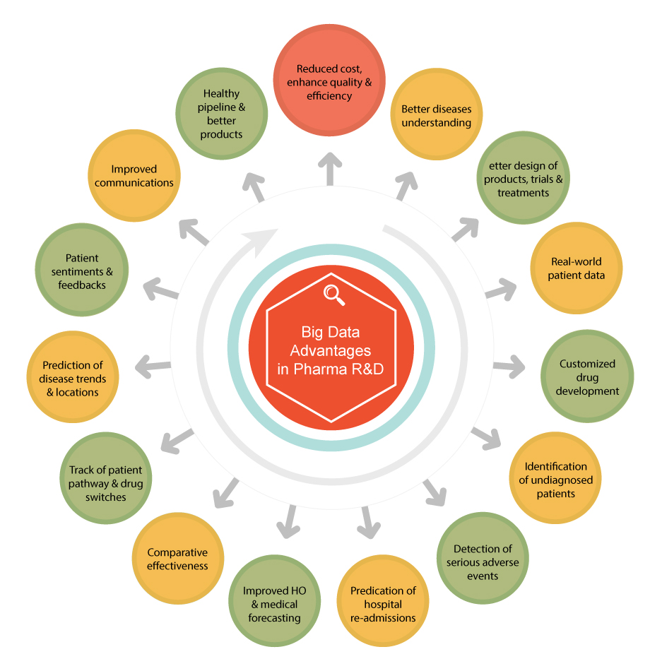The figure below highlights the multiple advantages of implementing Big Data in pharma R&D.