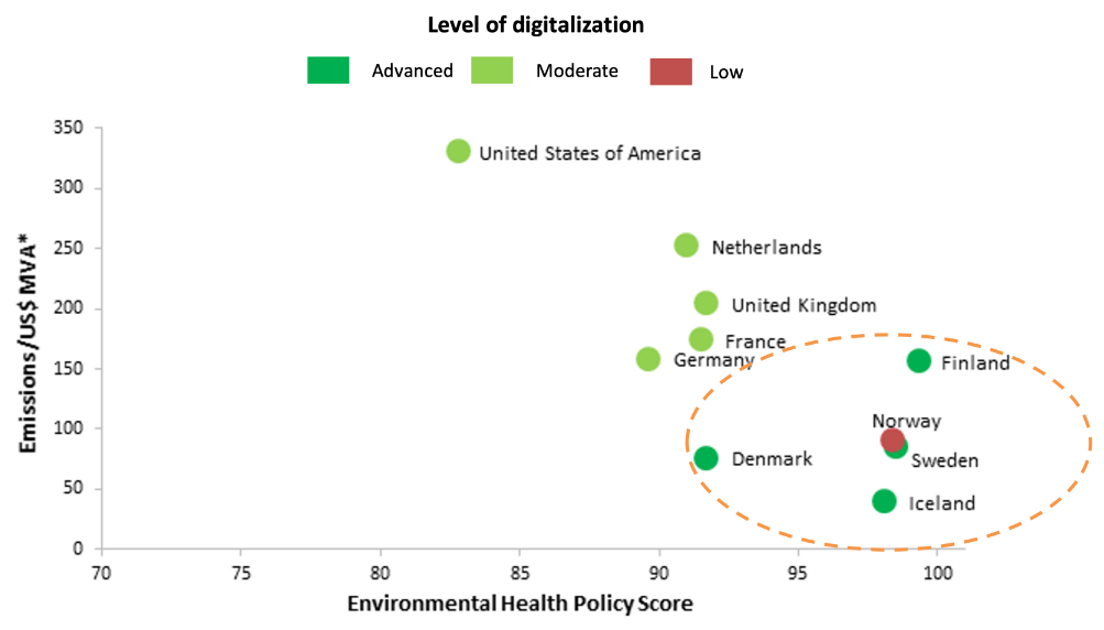 Note: The Environmental Health Policy score measures how well countries are protecting their populations from environmental health risks and is made up of four issue categories: Air Quality, Sanitation & Drinking Water, Heavy Metals, and Waste Management. *Manufacturing value added