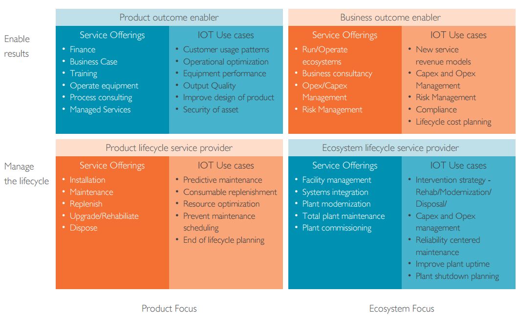 With all the buzz around IoT, it is easy for industrial manufacturers and their service business heads to get carried away with the hype and rush headlong in to IoT initiatives. While IoT opens up a world of value creation opportunities for manufacturers, it can only be as effective as the underlying business strategy. Manufacturers should explore the entire gamut of service opportunities that they can potentially address, evaluate their current capabilities and make a set of strategic choices. Based on this they should build the required capabilities including IOT enabled capabilities.