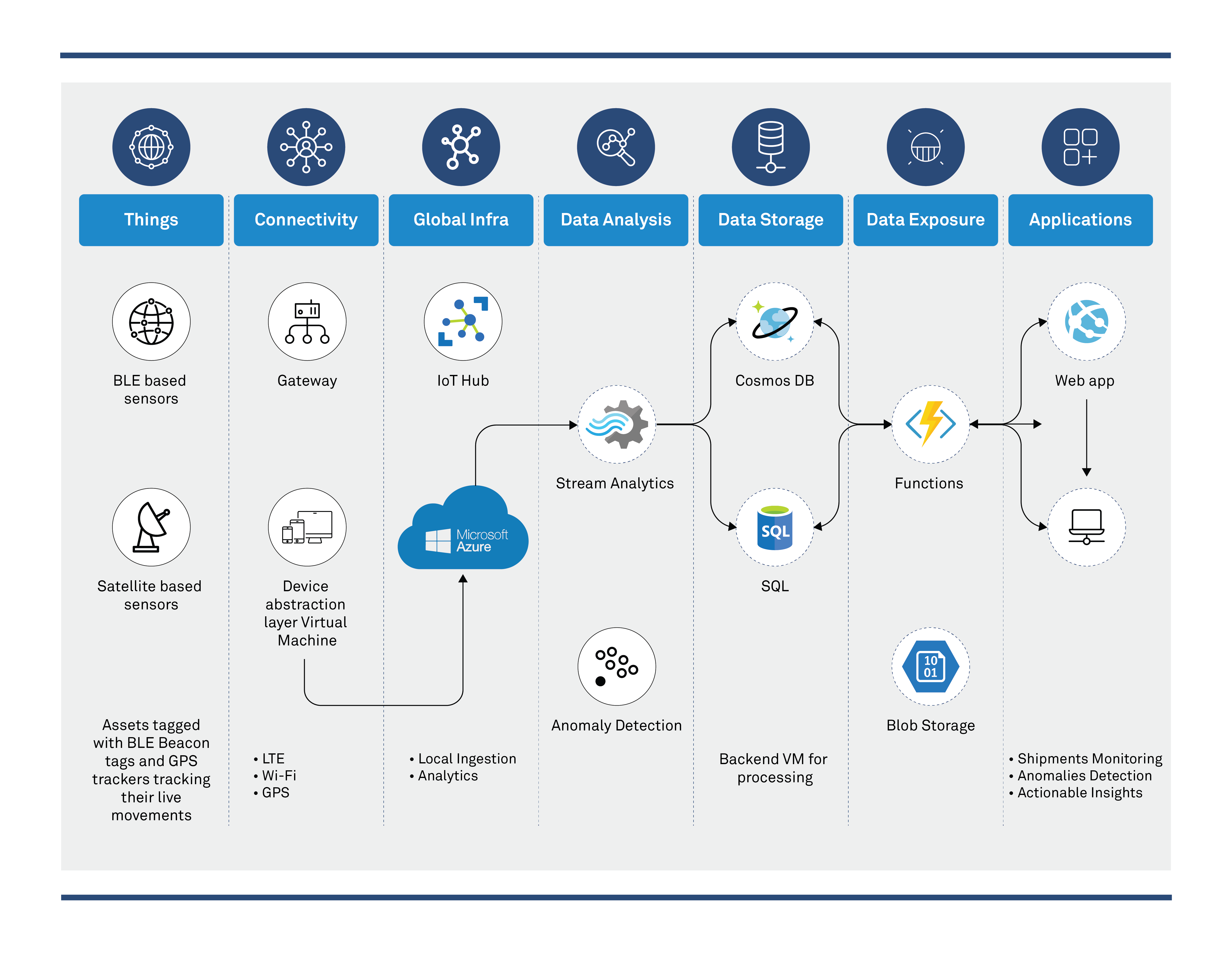 Industrial IoT: Industrial IoT gathers, analyzes, and acts on data from sensors and devices (Azure IoT suite) to anticipate and prevent problems, maximize quality and efficiency, and guide the design of future products. It utilizes machine learning, Azure Compute, mobile, and Azure Edge computing to remotely monitor and optimize manufacturing, logistics, and other operations.