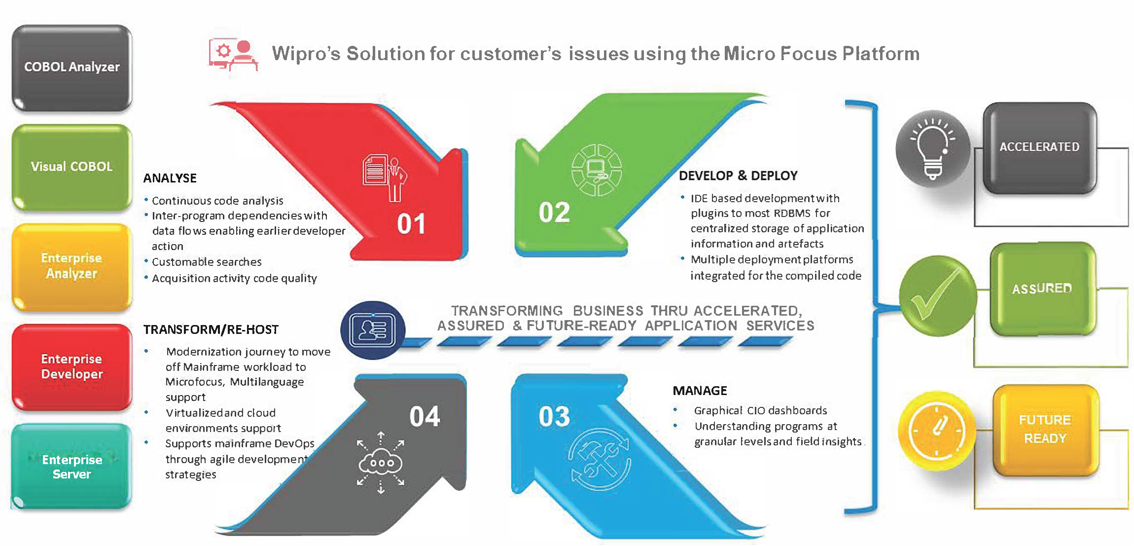 A Micro Focus permite essa transformação com o mínimo de custo e risco, por meio de uma solução conjunta abrangente com a Wipro em três pilares principais de modernização: