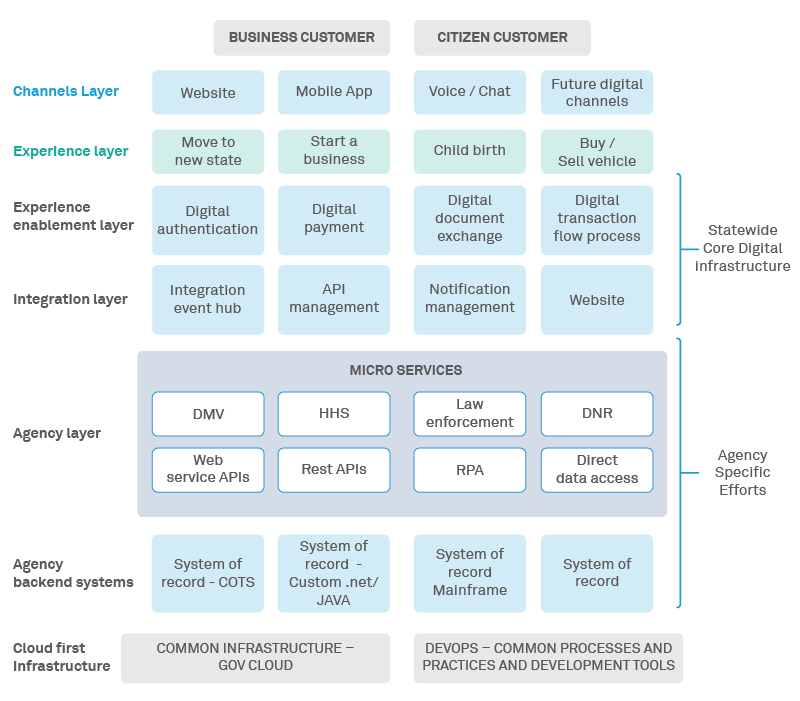 We see a higher role for a centrally controlled technology agency to unify the digital experience of citizens. This article focuses on an architecture view that can enable a unified view of the government to citizens, without significantly impacting the core functioning, data sovereignty, or the IT setup of the state and local departments.