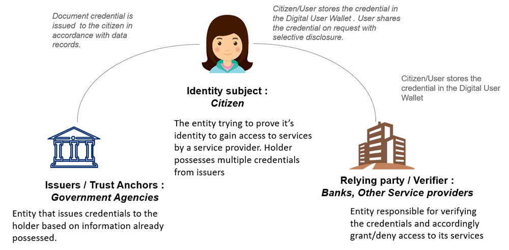 - Document issuing agencies – public or private, create a document credential and issue it to the citizen, which can be stored in a Digital Document Safe – User wallet. The proof of document credential issuance is recorded on Blockchain