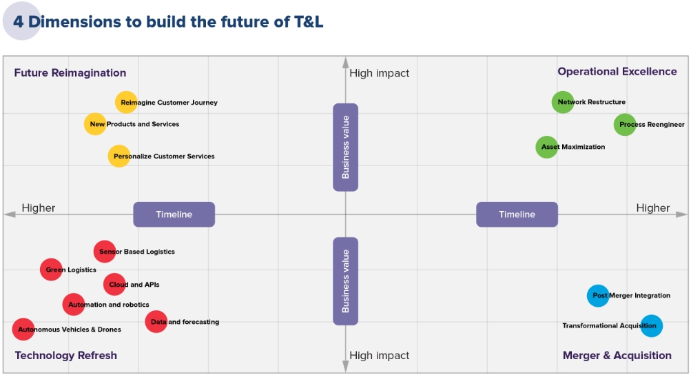 In the last three years, the world has endured unprecedented changes that wreaked havoc on global supply chains. In response, the T&L industry will need to transform. Companies must institute a different strategy to build the future of transportation and logistics. By covering four key imperatives – future reimagination, operational excellence, technology refresh and merger and acquisition, T&L companies can acquire new markets and add new capabilities to create value, transform and future-proof their businesses.