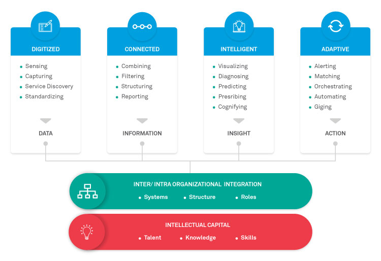 We map these capabilities along two core dimensions of technology enablement: automation and insight. Many technologies automate decisions and actions, including computations, transactions, data capture, physical transformations and movements, and more. Automation substitutes capital for labor in ways in which it improves efficiency and quality by lowering costs, speeding-up processing and transitions, improving consistency, and increasing resource availability. Technologies that improve insight increase visibility and intelligence by connecting stakeholders, structuring and sharing information, and cognifying processes, that is, developing knowledge through analysis and learning. In its most essential form, digital transformation is about developing automation and insight to radically advance visibility, intelligence, efficiency, and customer experience and agility, as well as customization.